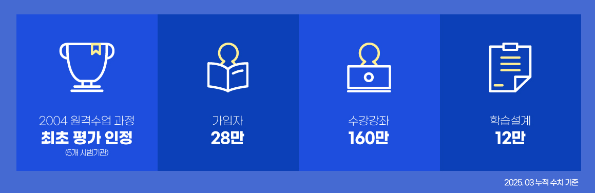 매년 교육부 평가에 의해 사라지는 수많은 학점은행제 교육기관들 사이에서 한국사이버평생교육원은 변함없이 그 자리를 지키며 누적 학습자 28만명을 돌파하였습니다. 학위취득, 자격증취득, 대학 편입, 대학원 진학, 자기계발 등 학습자 개인의 목표에 따라 학습효율과 편의를 높이고 있습니다.